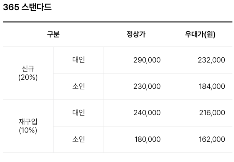 동일 권종 신규 요금 구입 또는 365/350스탠다드 재구입 요금 가능 | 해당 없음 | 13만원 | 다른 권종으로만 재가입 가능 |