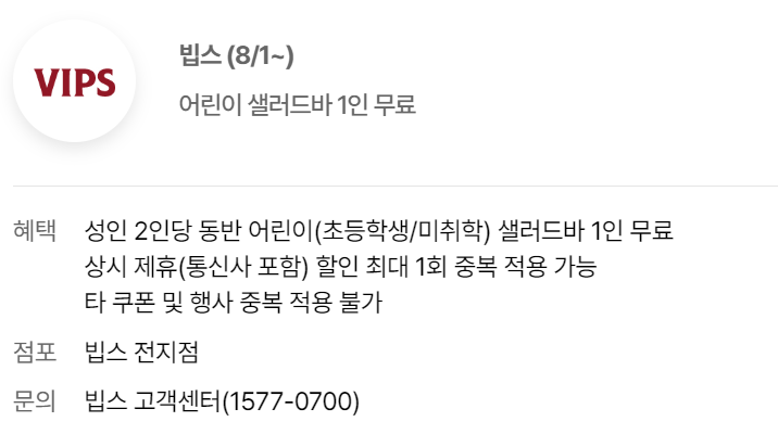 성인 2인당 어린이 1인(미취학, 초등학생) 샐러드바 무료