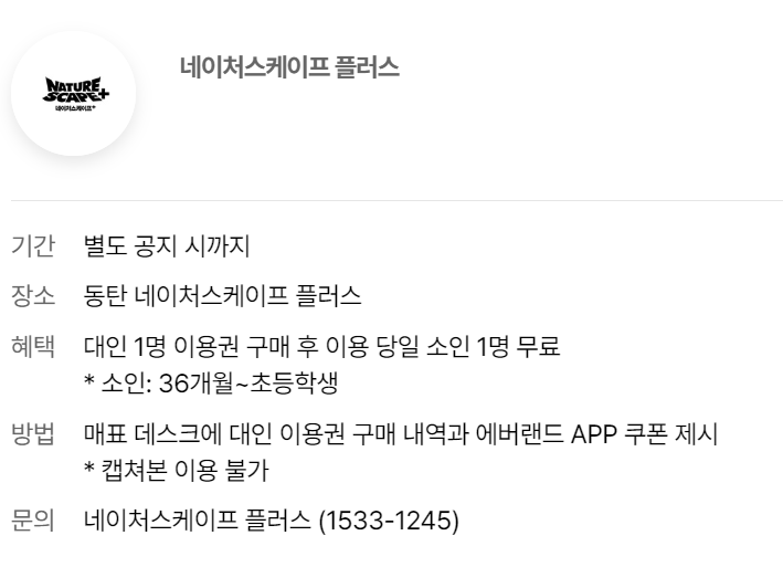대인 1명 이용시 소인 1명(36개월~초등학생) 무료